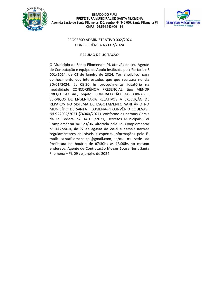 AVISO CONCORRÊNCIA PRESENCIAL Nº 002/2024