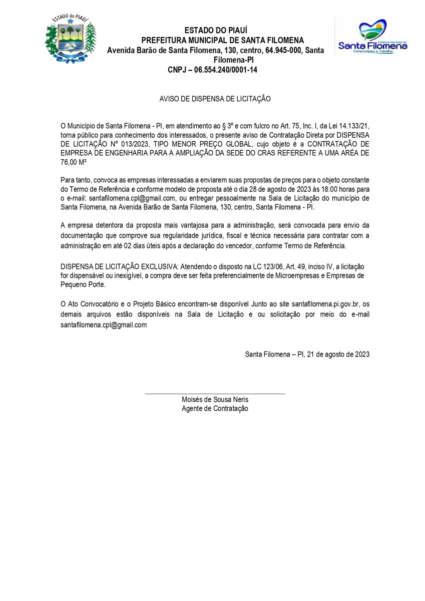 Aviso de Dispensa nº 013/2023