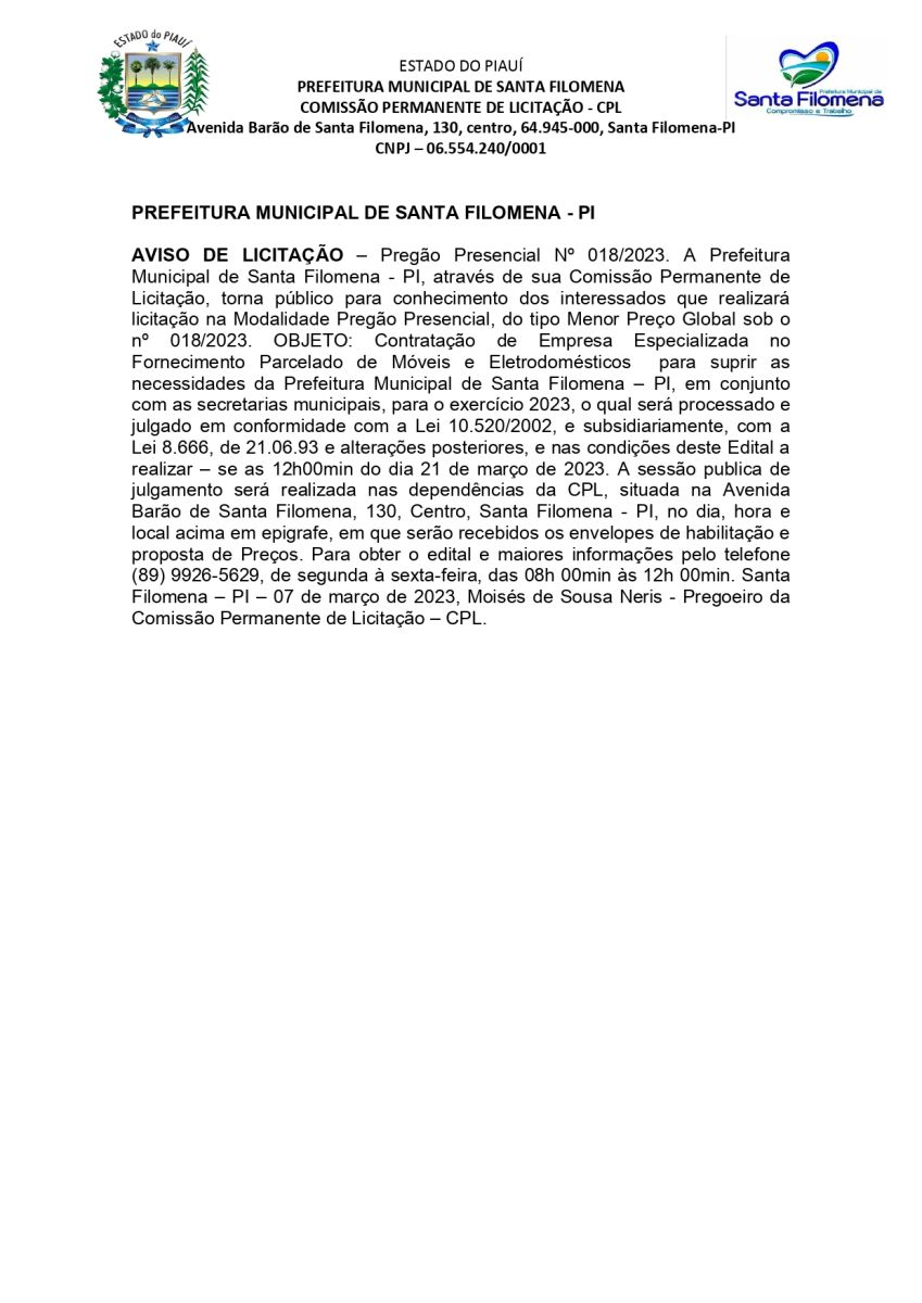 Aviso de Pregão Presencial 018/2023
