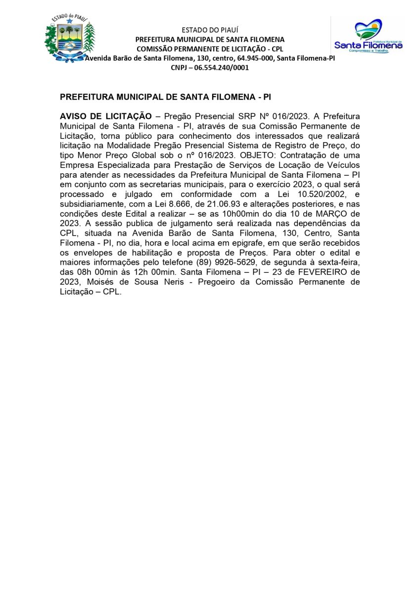 Aviso de Pregão Presencial SRP 016/2023