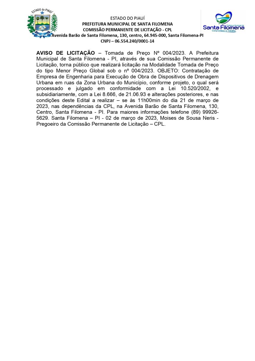 Aviso de Tomada de Preço 004/2023
